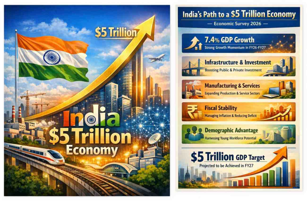 India stands at a decisive moment in its economic journey as the Economic Survey 2026 presents an optimistic yet grounded outlook for the coming years. According to the Survey, the Indian economy is projected to grow at a robust rate of around 7.4 percent in FY26–27, setting the stage for the country to cross the long-anticipated $5 trillion GDP milestone in FY27. This projection places India firmly among the fastest-growing major economies in the world, reinforcing its rising stature in global economic affairs.